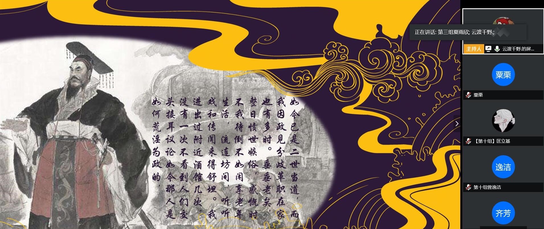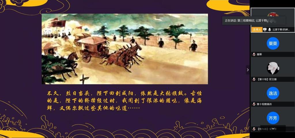 活动由历文院院课外部干事刘乐瑶主持,全体“优秀历史纪录片赏析”课程的同学参加了此次活动。活动采用新颖的方式带领我们了解历史人物,以臣子、好友、助理等角度帮助我们了解真实的历史,以同时代人物的角度改变了以往站在当代介绍历史人物的固定模式,带我们更加了解历史上真实的他们。各组成员经过精心的准备,运用幻灯片、影视节选、图片等形式作为辅助,对自己两个月以来的课程学习交上了一份满意的总结。前来观摩的指导老师对各组同学的表现也给予了高度的评价。活动结束后,全体学员在QQ群内通过投票方式,选出第一小组展示的“若为汉献帝我看曹操”为此次特色活动的优秀作品,第一小组最后获得最佳小组称号。