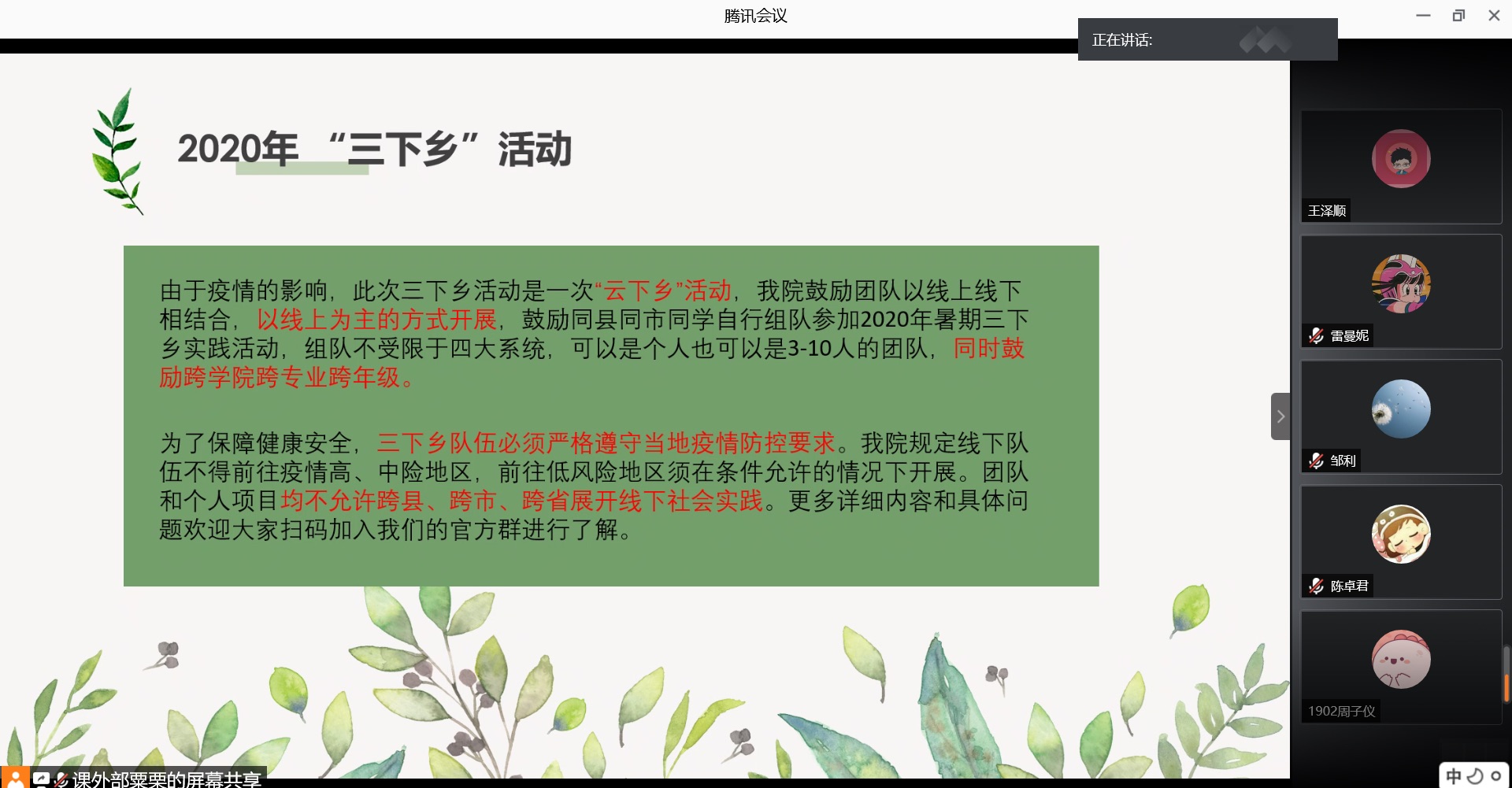 (通讯员 刘乐瑶 王娜鹃)7月13日下午,由团委课外部组织的2020年暑期社会实践宣讲会在腾讯会议平台以线上形式开展。此次活动邀请到了77779193永利官网团委书记、学工办老师兼19级辅导员陈卓君以及四位主讲人沈心雨、周欢、刘杭波和王玉霜到场,2019级全体同学参加会议。