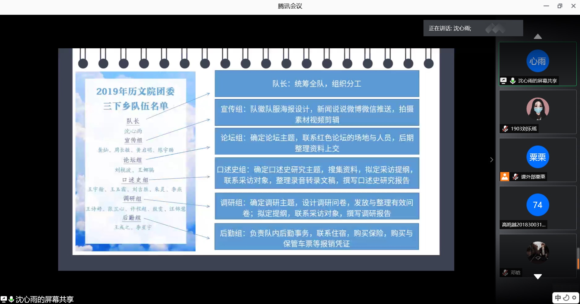 四位主讲人分别就三下乡队伍筹备及收尾工作、红色论坛、口述史、社会调研四大方面进行了详细介绍。沈心雨以自己带领的团队为例,对实践队伍的组建与分工、个人安全问题以及实践项目材料填报进行了分享,用生动的实例让同学们清晰地了解到三下乡的概况。周欢提出同学们普遍存在对社会调研的认知误区,对调研的意义及注意事项进行了具体分析。王玉霜针对寻找有价值的研究对象、确定访谈提纲、“三要做、三不做”访谈注意事项以及资料整理与报告撰写等方面分享了自身的经验。刘杭波则从论坛地点选择、论坛内容确定、论坛任务分工和论坛材料整理几大方向做了充分介绍。