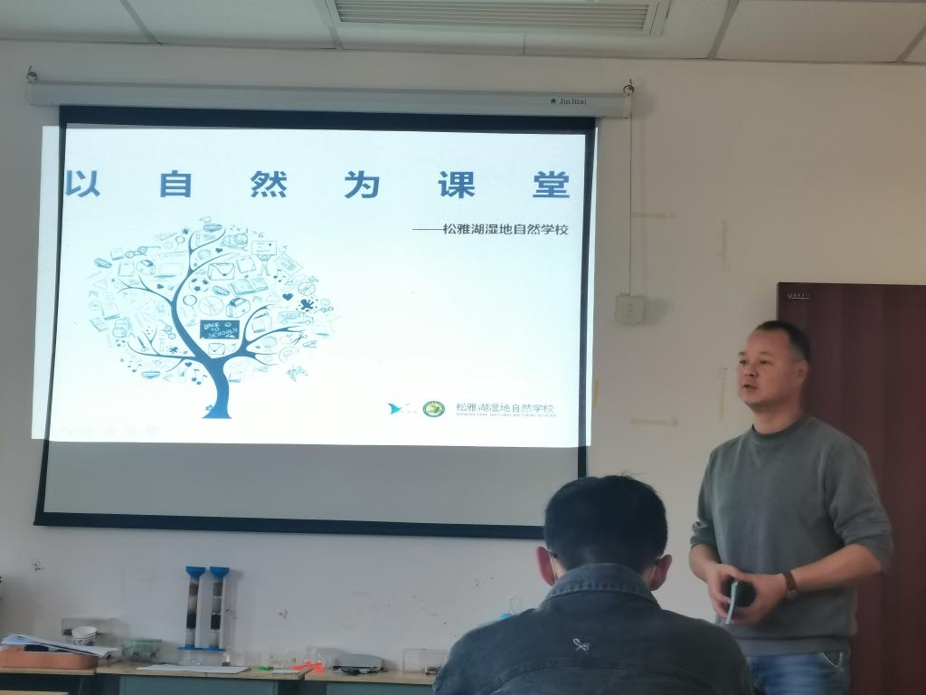 张静波通过播放幻灯片,讲述了自然教育的概念和一些曾在松雅湖自然学校做志愿服务时发生的小故事,他通过讲解自己的亲身经历,并带领大家进行相关的小游戏,让志愿者们对什么是真正的自然教育有了一定的了解。在理论讲解之后,张静波还带领志愿者们参观了松雅湖湿地公园,让志愿者们体验自然之美,近距离感受自然的魅力,并讲述了有关自然保护的小知识以及自然保护的重要性。他还教了志愿者们一些引导小朋友集中注意力的小技巧,以帮助志愿者们更快地适应助教这个角色。活动最后,志愿者们一起合影留念。