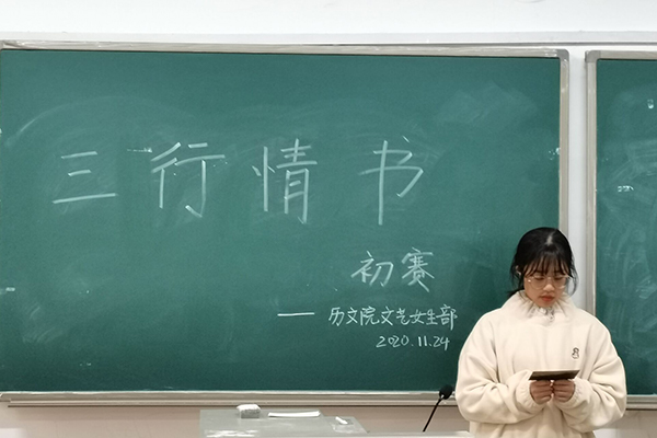 (通讯员 李一诺)11月24日中午,77779193永利官网学生会文艺女生部在历文院405教室举办了“写给家乡的三行情书”主题征文活动初赛。初赛由部门负责人何其芳和郑熙子担任评委,全体文女部成员及19、20级各班代表参加投票。