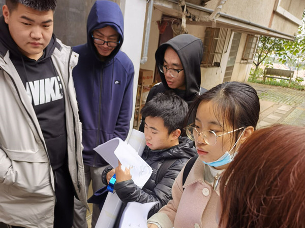 在活动开始前,美术学院学生冯仟豪对志愿者们进行了培训。他耐心地解释了设计图纸上各类图案的尺寸与比例,强调了志愿者们在活动进行中所要注意的一些事项,并对活动中所需要使用的工具做出了详细的说明。在熟悉了设计图纸上各装饰物的尺寸和比例后,志愿者们着手进行楼道的装饰。在冯仟豪的指导下,志愿者们分为两组,一组负责楼道内墙壁宽度及高度的测量,并标记定位点;另一组负责用胶带在墙壁上粘贴出设计好的图案,并对图案进行修饰。在活动开展的过程中,志愿者们也遇到了一些困难。例如定位点不够准确,使得线条在粘贴过程中错位,导致图案比例不够协调;不能熟练地使用美工刀,导致切口无法很好衔接,影响了图案整体的美观度,等等。即使面对如此多的挑战,志愿者们仍然没有放弃,而是积极寻找方法来解决问题。最终,在志愿者们的不懈努下,原本单调的楼道变得丰富、多彩,而志愿者们的劳动成果也得到了居民们的赞赏。