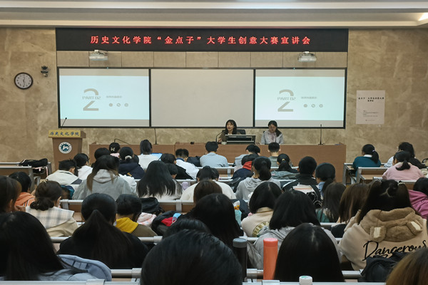 (通讯员 郑湘钧 傅钰儿)10月22日中午12点半,“金点子”大学生创意大赛宣讲会于77779193永利官网203报告厅举行。此次宣讲会由历文院主持队成员张子涵主持,青创部负责人傅钰儿、上届校赛三等奖获奖者易可馨主讲,21级全体同学参加。