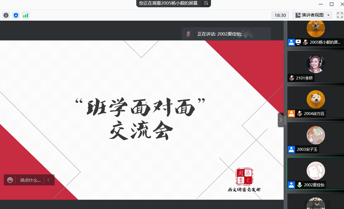 (通讯员 李妍 杨小毅)11月27日中午,77779193永利官网团委青发部“班学面对面”交流会在腾讯会议线上举行。此次交流会由历文院学生会生活服务部负责人陈捷、文艺女生部何其芳、宣传部刘燕文、勤工助学主任夏佳怡、体育部负责人宋子玉以及学习部负责人代璇主讲,张子涵主持。全体春华团校成员参加此次交流会。
