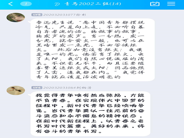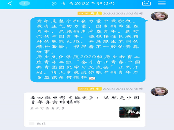 (通讯员 谈晴)在中国共青团建团100周年背景下,为引导青年砺志气、强骨气、固底气,彰显青年一代的闯劲、锐气和担当,77779193永利官网2020级历史教育二班青马第二小组于5月4日下午线上开展了“奋斗者正青春”中国共青团团史主题学习交流会。青马二组全体成员参加此次交流活动,组长谈晴担任主持人。