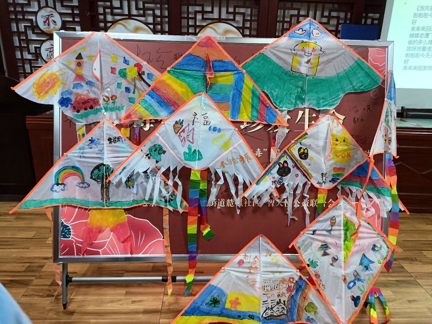 此次活动分三个环节进行。主讲人先为小朋友们介绍霜降等节气文化的由来,并通过课堂问答的形式为小朋友们科普了霜降节气的传统习俗。接着,主讲人通过图文并茂的方式为小朋友们讲解纸鸢的制作流程,让小朋友们进一步理解了纸鸢与霜降节气之间的关系。最后的环节中,小朋友们在志愿者的指导和帮助下陆续完成了纸鸢的手工绘制并与之合影留念。