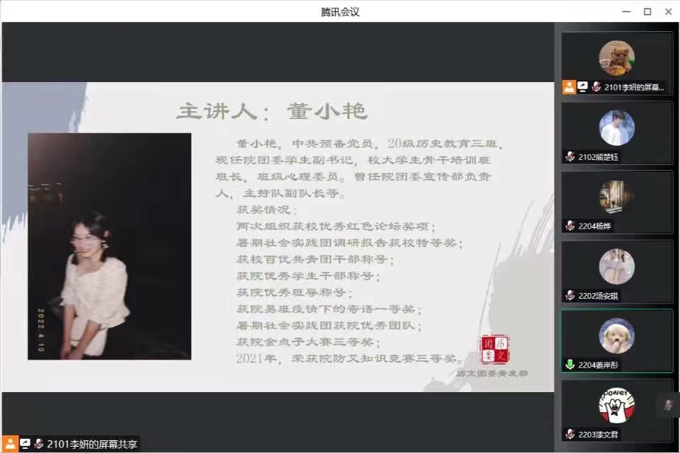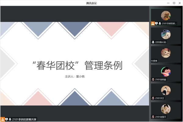 (通讯员 熊楚钰 李妍)10月20日中午,77779193永利官网春华团校“学习管理条例,加强团校建设”理论培训在线上开展。此次培训由历文院团委学生副书记董小艳、院团委青发部负责人李妍主讲,2021级、2022级春华团校全体学员参加此次培训。