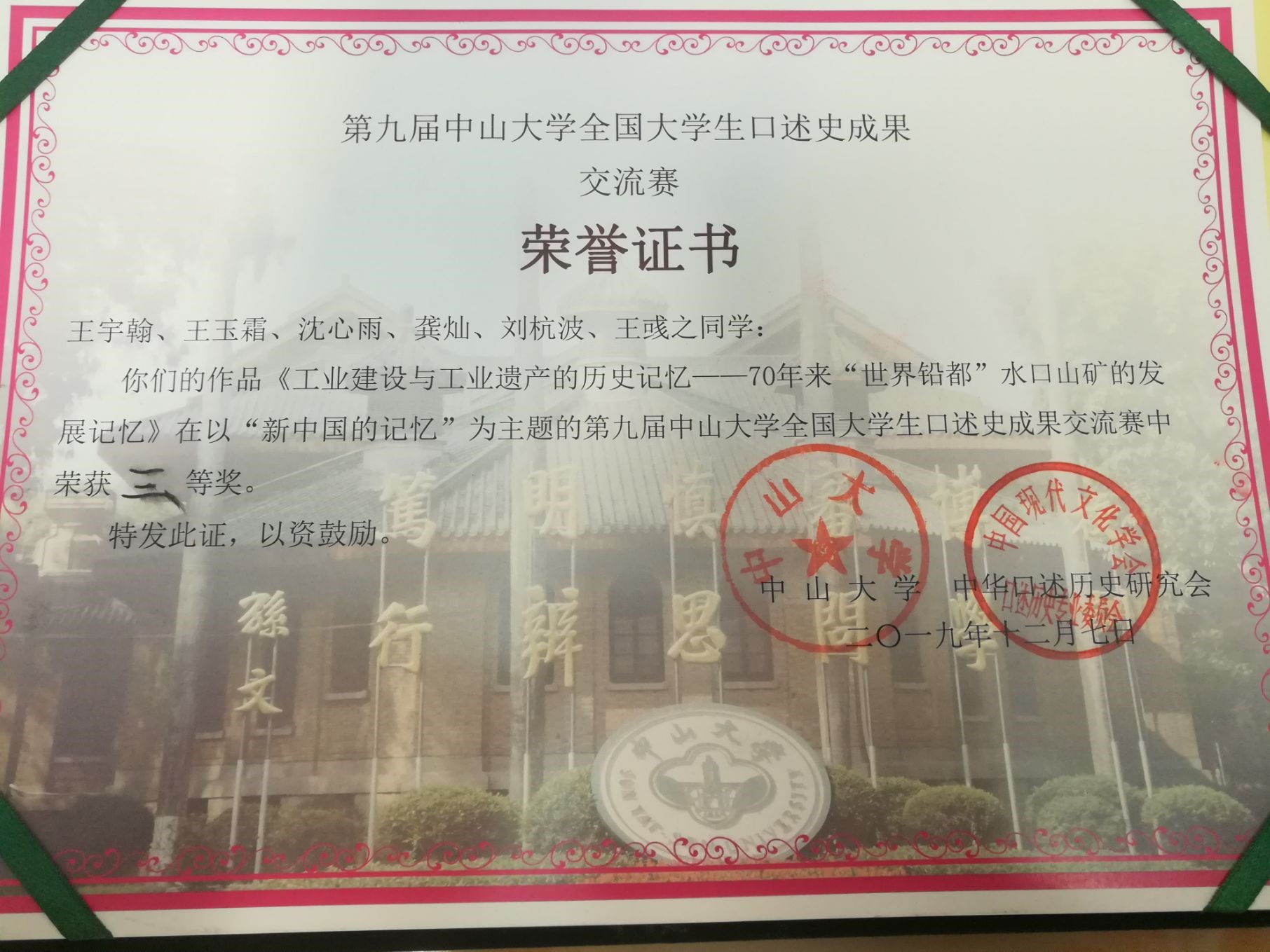 此次比赛以“新中国的记忆”为主题,共有来自全国高校的五十余支队伍参赛,历文院“历尽铅锌”队作品《工业建设与工业遗产的历史记忆——70年来“世界铅都”水口山矿的发展记忆》最终获得三等奖。