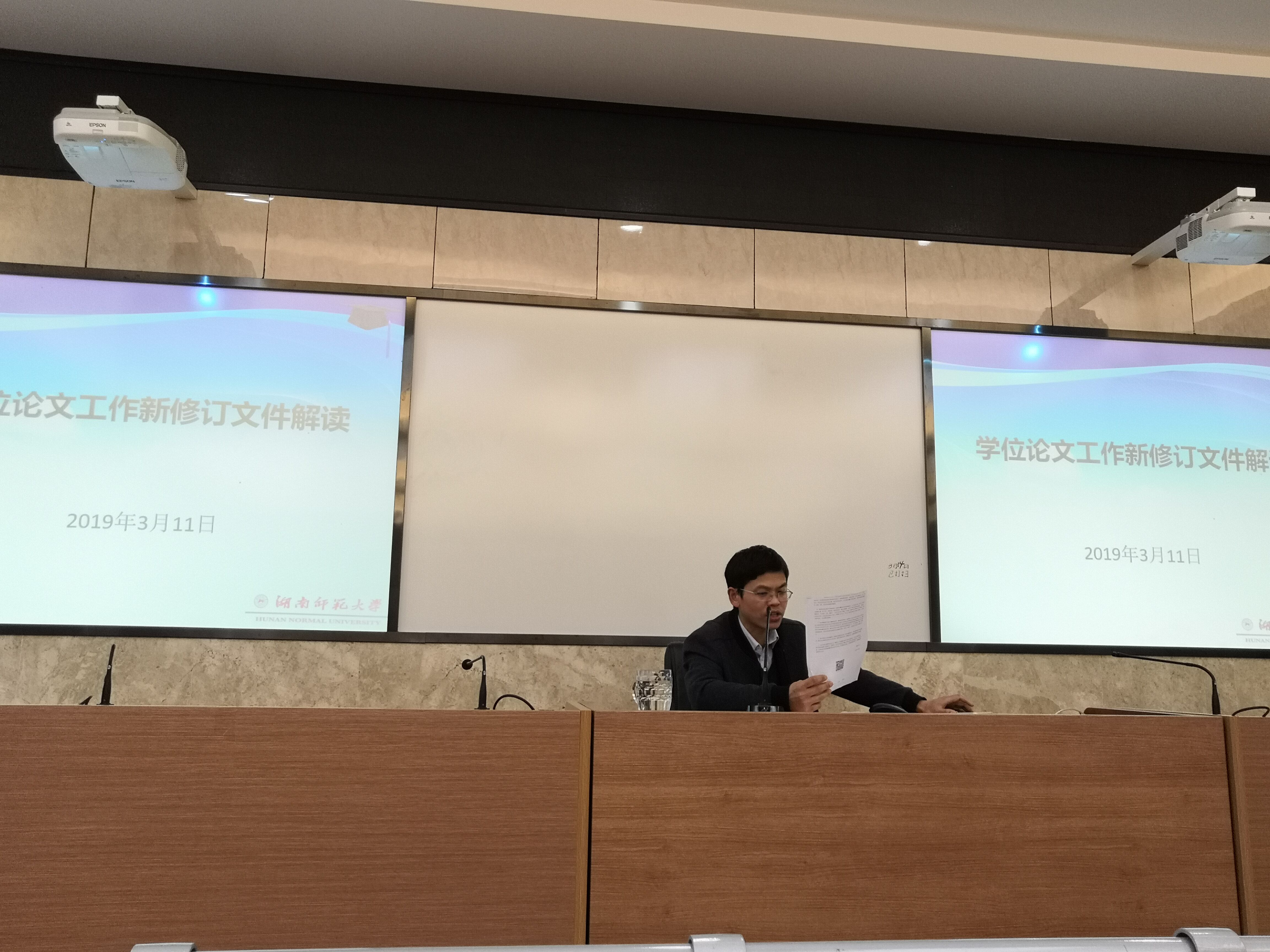 首先,刘利民教授详细解读了学位论文工作新修订文件,并联系湖南师范大学研究生手册中《湖南师范大学研究生学位论文预审管理办法(试行)》等相关办法,指出毕业生特别容易忽略的几处地方,强调了提高研究生论文质量的重要性。