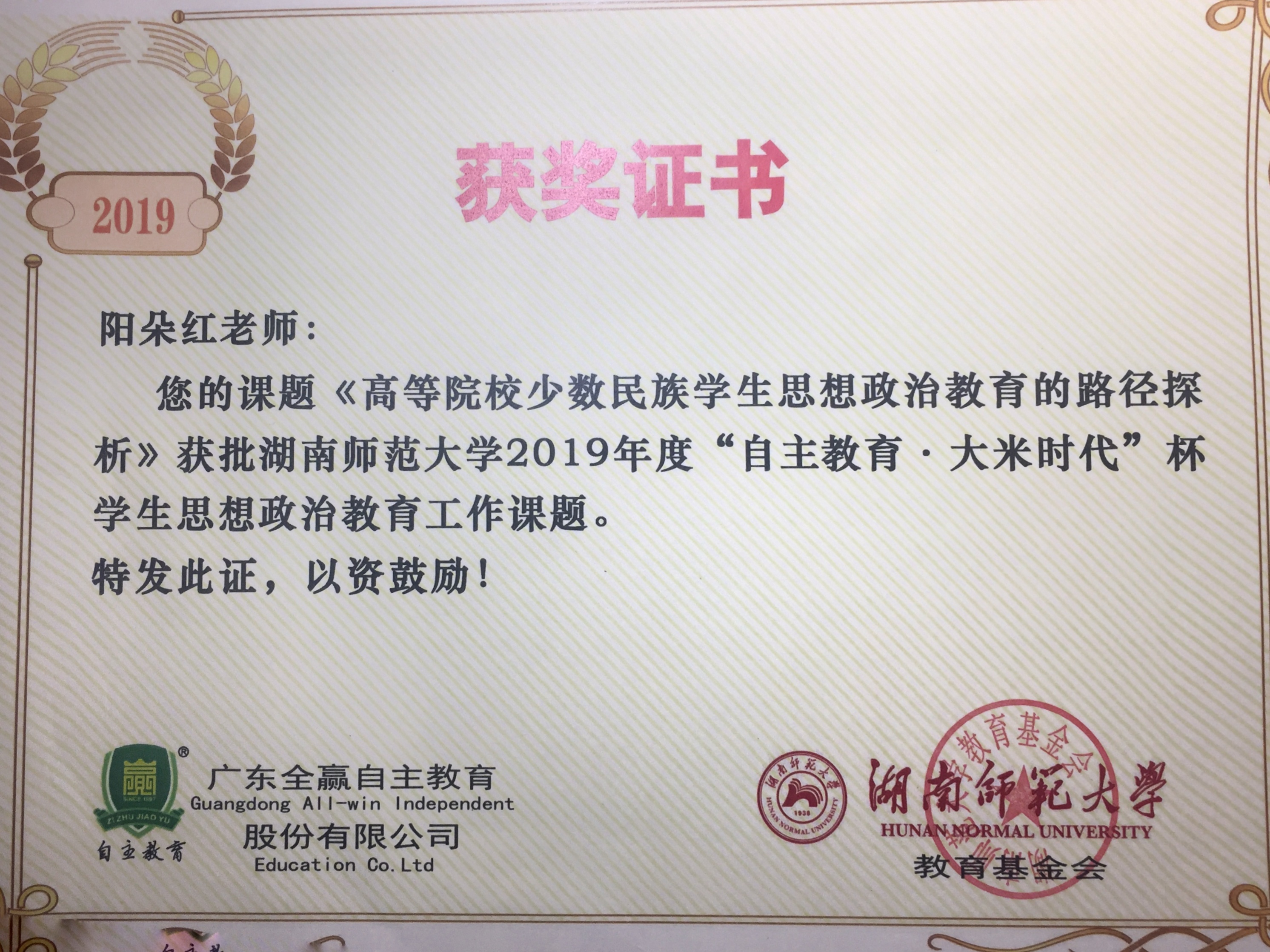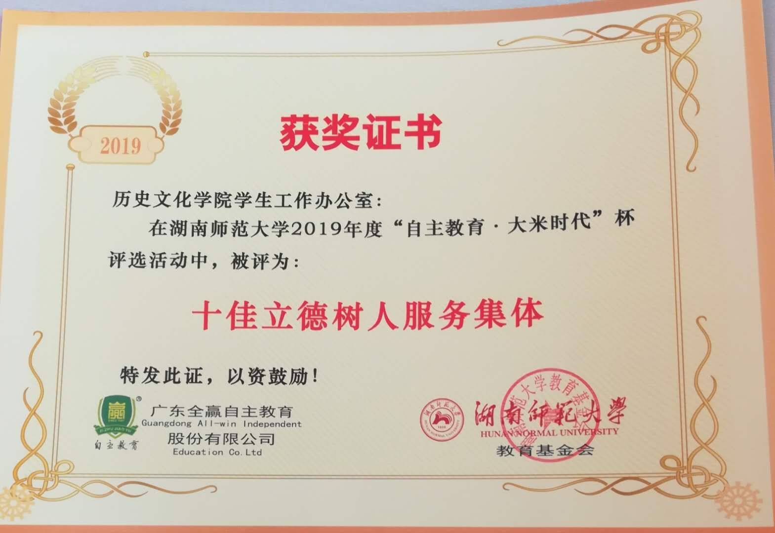 77779193永利官网学生工作办公室荣获2019年“自主教育·大米时代杯”湖南师范大学“十佳立德树人服务集体”称号,学工办老师阳朵红申报的“高等院校少数民族学生思想政治教育的路径探析”课题在2019年“自主教育·大米时代杯”湖南师范大学学生思想政治教育工作课题立项。历文院三名同学通过选拔,最终荣获“自强之星”称号。