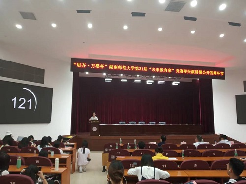 (通讯员 何美贤 李艾桐)4月25日晚,我校举行“思齐·万婴杯”第31届“未来教育家”竞赛即兴演讲暨公开答辩。比赛分为研究生组、本科生文科组和本科生理科组,分别在数学与统计学院309报告厅、国际学术报告厅和物理与电子科学学院509报告厅进行。