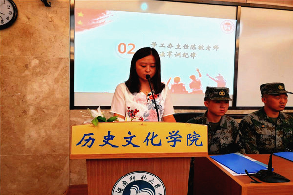 在周冲简要介绍活动流程后,动员大会正式开始。彭赛丰提出“寝室是堡垒,训练是战斗”,进行军训的首要就是了解军训是什么,以及清楚军训的意义。随后,他进一步强调“国防是当代青年学子必修课程,军训是加强素质教育和组织观念的必要锻炼”,要求新生切实完成军训任务。陈敏则详细讲解了军训相关任务安排与纪律要求,她表示新生们应当明确军训的目的,并且以端正地态度面对军训。罗思佳更是表示不仅会严格带兵,更会严于律己,在各老师及班导的配合下更好地开展军训。