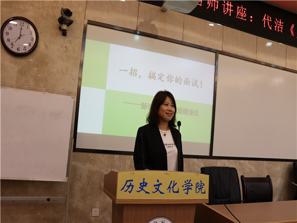 代洁从自己作为历史教研员,多年参与招聘活动的经历出发,询问同学们“20分钟你想干什么”,“20分钟你能干什么”,提出在招聘考试的20分钟的准备时间里,考生应该做到明确授课目标,贴合大纲立意,准备恰当的导入,过渡语,学生活动和小结升华等。随后,代洁以《中国共产党的诞生》这一课为例设置20分钟招聘考试现场,同学们积极参与展示,代洁带领同学们分析考题,结构性问答的指向什么考点,课堂展示的引入和板书逻辑如何呈现,对同学们的表现进行充分评价。最后代洁展示了几种在招聘考试中经常出现的错误,让同学们学到如何设置有冲突性的导入,如何明确教学目标,如何理清教材内在逻辑,以及注重历史教学中的价值观,历史观。代洁指出,历史教学的最终目标是尊重人和发展人。