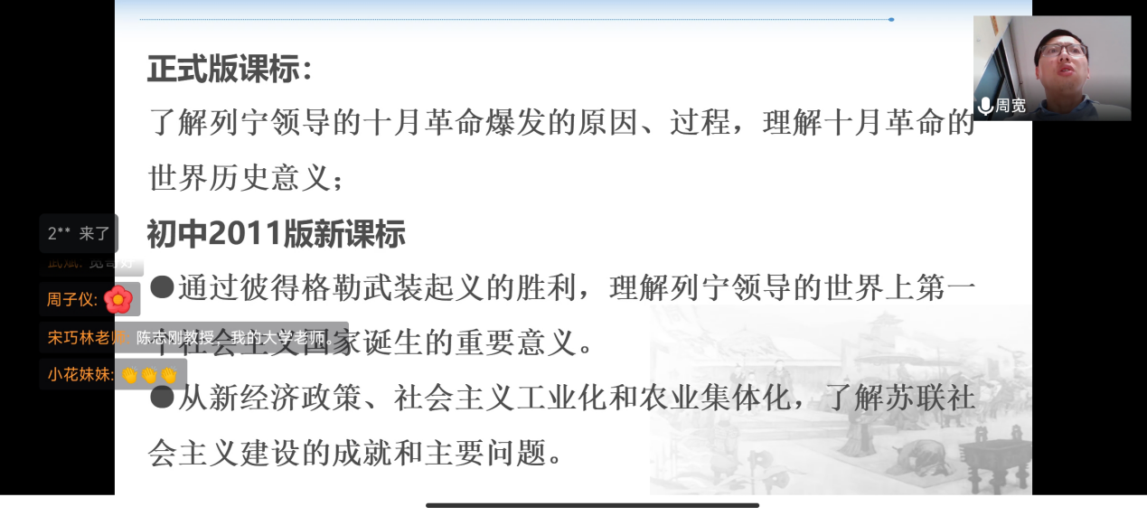 周宽首先提出本次讲座主题的由来:《中外历史纲要》教科书教材容量巨大,课程标准提出对教学内容进行整合、处理,因此他对此进行研究并取得相应的成果。随后,周宽以纲要下第15课《十月革命的胜利和苏联社会主义的实践》为案例提出他进行教学处理的方法:第一,确立合适的教学立意。确立教学立意要求教师研读课标、关注学术前沿成果、阅读教材内容。第二,选取典型的史料。选取史料时要注意材料不等于史料、史料不等于史实、史料内容要丰富、形式要典型。第三,进行规范的设计,包括导入结语、问题、板书和情境等。教学设计中导入要激发学生内心的学习动机、结语要升华学生内心的学习体验、导入与结语要首尾呼应,在设计问题时要做到开放性与非开放性相结合、层次性与连续性相结合。