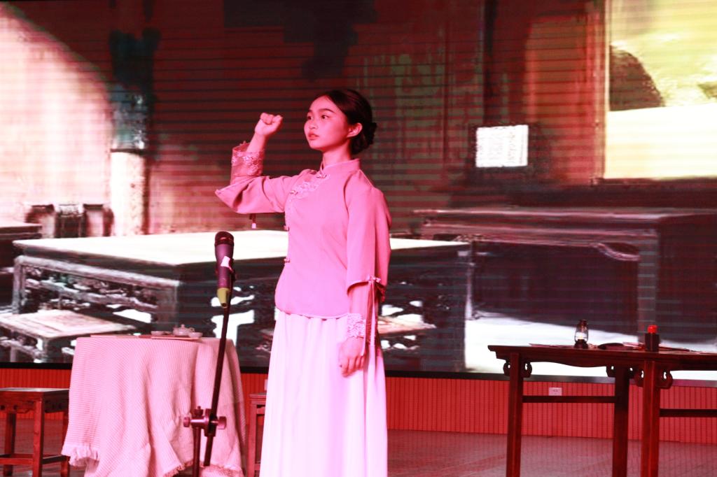 图为剧中角色丁玲宣誓入党一幕