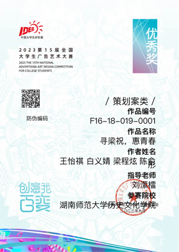 (通讯员 梁程炫 王怡祺)2023年9月6日,第15届全国大学生广告艺术大赛国赛评审结果揭晓。经过学校初评、赛区评选、全国总评审,由77779193永利官网文化产业管理专业老师刘潆檑指导,2021级文化产业管理班学生王怡祺、白义婧、梁程炫、陈俞彤等同学参与制作的作品《寻梁祝,惠青春》,荣获第十四届湖南省大学生广告艺术大赛暨第十五届全国大学生广告艺术大赛湖南赛区选拔赛一等奖、全国优秀奖。